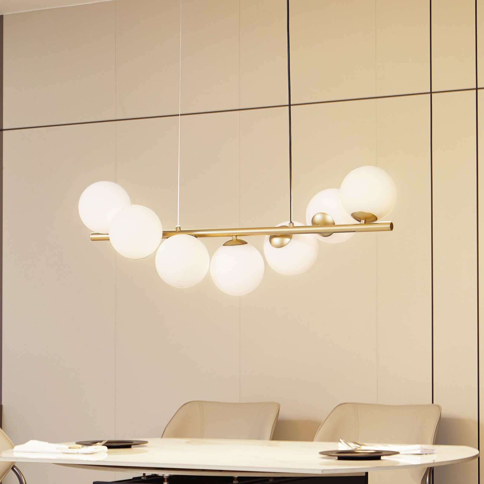 Suspension Isandro aux courbes harmonieuses La suspension à 7 lampes Isandro de Lucande, incarne un style moderne qui s’intègre parfaitement à l’ambiance d’une salle à manger. La couleur dorée mate associée aux boules de verre opales souligne l’élégance du design et fait de ce luminaire un point de mire marquant. La nature opaque de chaque sphère diffuse une lumière diffuse et non éblouissante, idéale pour l’éclairage général au-dessus de la table de la salle à manger.